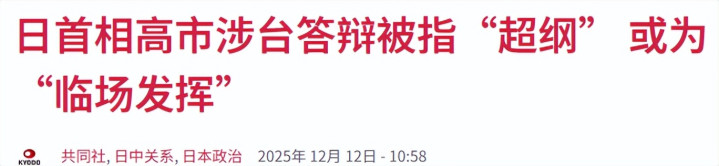 实际上,高市也作出了这样的答辩,但在反复交锋的过程中说出了“无论怎么想,这都是可能构成存亡危机事态的情形”,但事先拟定的资料中并未包含这一表述。其这番答辩,立民党党首野田佳彦早在11月下旬的党首讨论中抨击这是“首相的独断专行”等,她的言论被认为超出政府内部事先拟定的要点范畴。辻元在X上指出,“这番答辩是首相的个人见解,已经明确这不是官僚撰写的内容。”