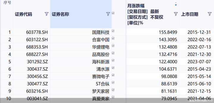 截至11月28日收盘,剔除当月上市新股,11月十大牛股中涨幅最大的是国晟科技,月累计涨幅达155.85%,国晟科技11月曾4次发布股票异常波动公告;合富中国以143.31%的月涨幅位列第二名;11月涨幅超100%还有华盛锂电、品高股份、海科新源、清水源4股。