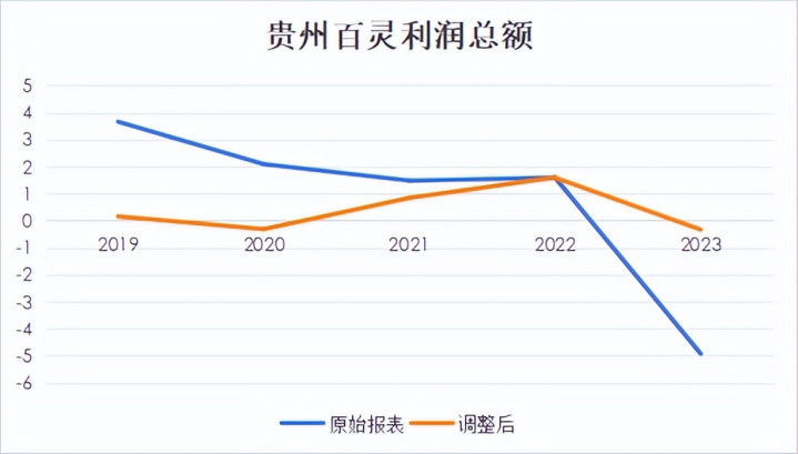 根据贵州百灵的原始财务报表,公司2019年至2023年的利润总额分别为3.66亿元、2.09亿元、1.48亿元、1.59亿元、-4.93亿元。按罚单认定的虚增/虚减金额调整后,2019年至2023年的利润总额分别为0.16亿元、-0.32亿元、0.84亿元、1.59亿元、-0.34亿元。不难发现,公司2023年通过一次性计提大额销售费用实现“财务大洗澡”。