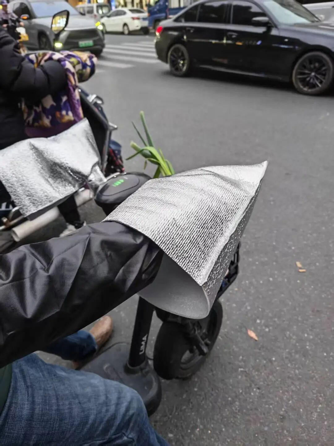 ▲送餐途中,徐海利注意到一位市民用保温袋自制骑车护手,“小成本解决大问题” 图/受访者提供
