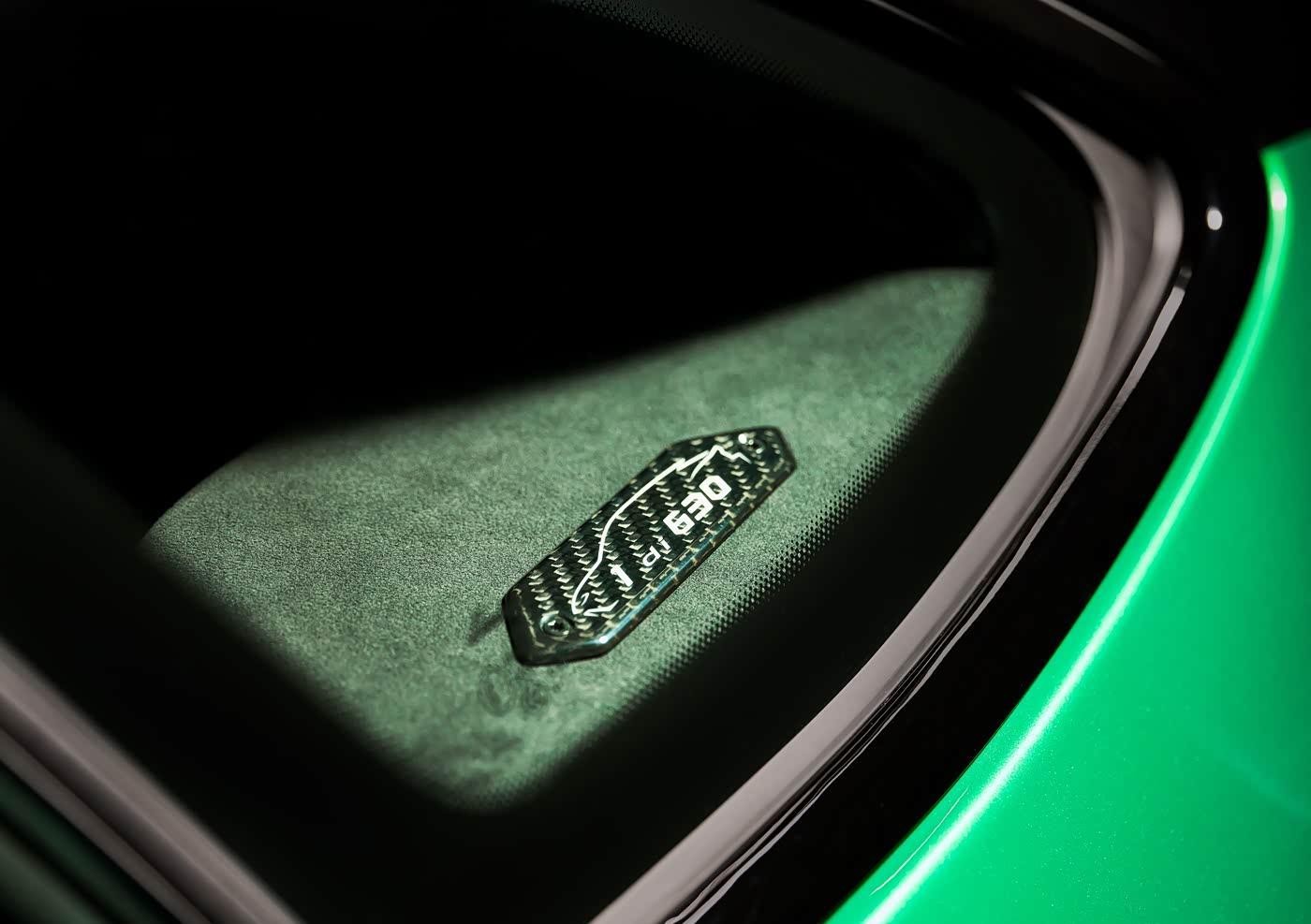 座舱大量运用碳纤维材质,副驾驶仪表台配有丝网印刷车型标识的碳纤维饰板,专属碳纤维标识铭牌纪念Ad Personam工作室十周年,同时致敬品牌高级个性化定制服务二十余年历程,中控台、仪表台、车门饰板也可装配碳纤维装饰件,搭配Dinamica皮革与Corsa?Tex微纤维,兼顾运动感与豪华质感。